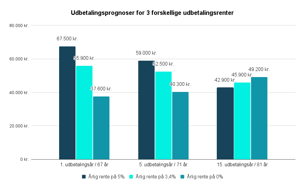 Figuren nedenfor viser en prognose for pensionsudbetalingen ved 5%, 3,22% og 0% i udbetalingsrente. Eksemplerne tager udgangspunkt i en 67-årig, der påbegynder pensionsudbetaling i 2026 med en opsparing på 1.000.000 kr., hvor halvdelen er investeret i aktier og den anden halvdel i obligationer.
