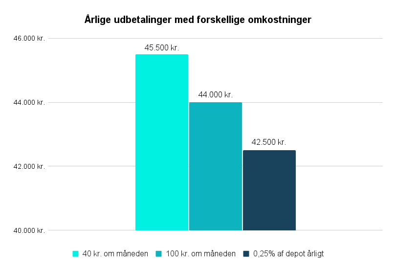 Figuren viser, at den forventede udbetaling ved pensionering falder fra 45.500 kr. til 44.000 kr. når de årlige administrationsomkostninger øges fra 480 kr. (40 kr. pr. måned) til 1.200 kr. (100 kr. pr. måned). Den forventede udbetaling falder yderligere med en årlig administrationsomkostning på 0,25% af opsparingen.