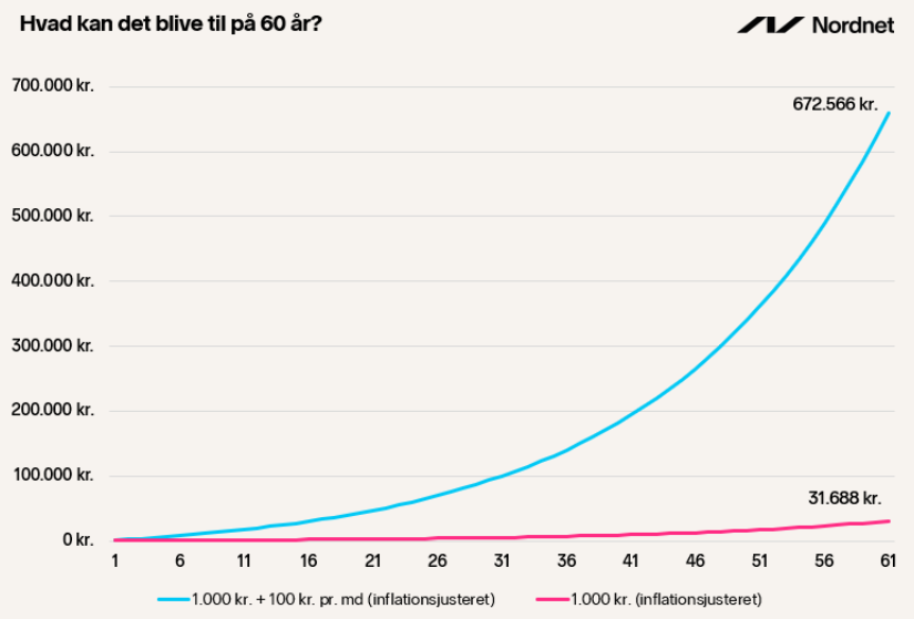 Figur 2: Hvad kan det blive til? Blå graf: 1.000 kr. investeret én gang + 100 kr. pr. mnd. Pink graf: 1.000 kr. investeret én gang. Tidshorisont: 60 år. Afkast: 7% i årligt afkast og justeret for inflation på 2% årligt. Der er også indregnet en årlig PAL-beskatning på 15,3%. Kilde: Egen tilvirkning. Husk, at historisk afkast ikke er garanti for fremtidigt afkast.