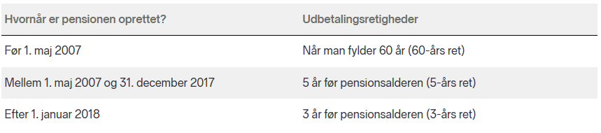 Figur 1: Udbetalingsrettigheder for pension. Kilde: Nordnet Academy. Som skemaet viser, er udbetalingsrettighederne løbende blevet justeret fra politisk side.